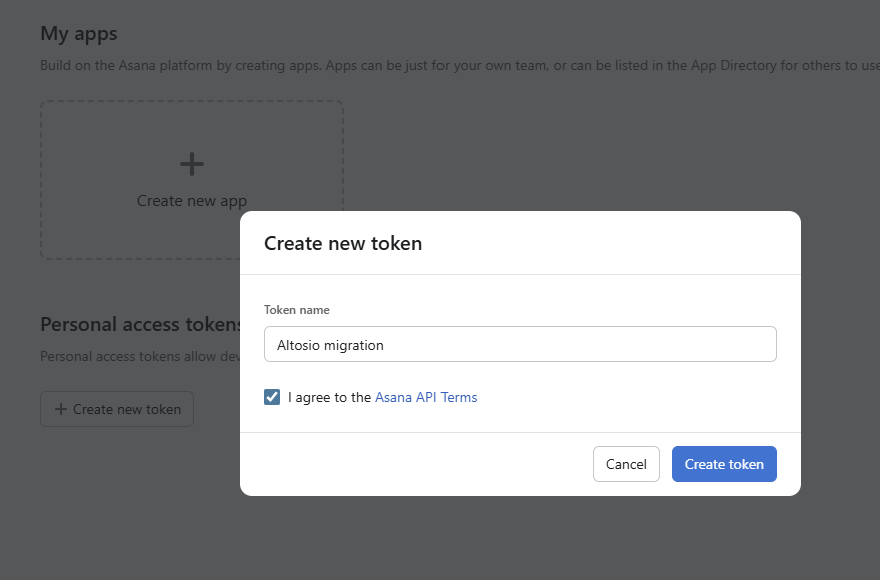 - Give your token a name and agree to the Asana terms.