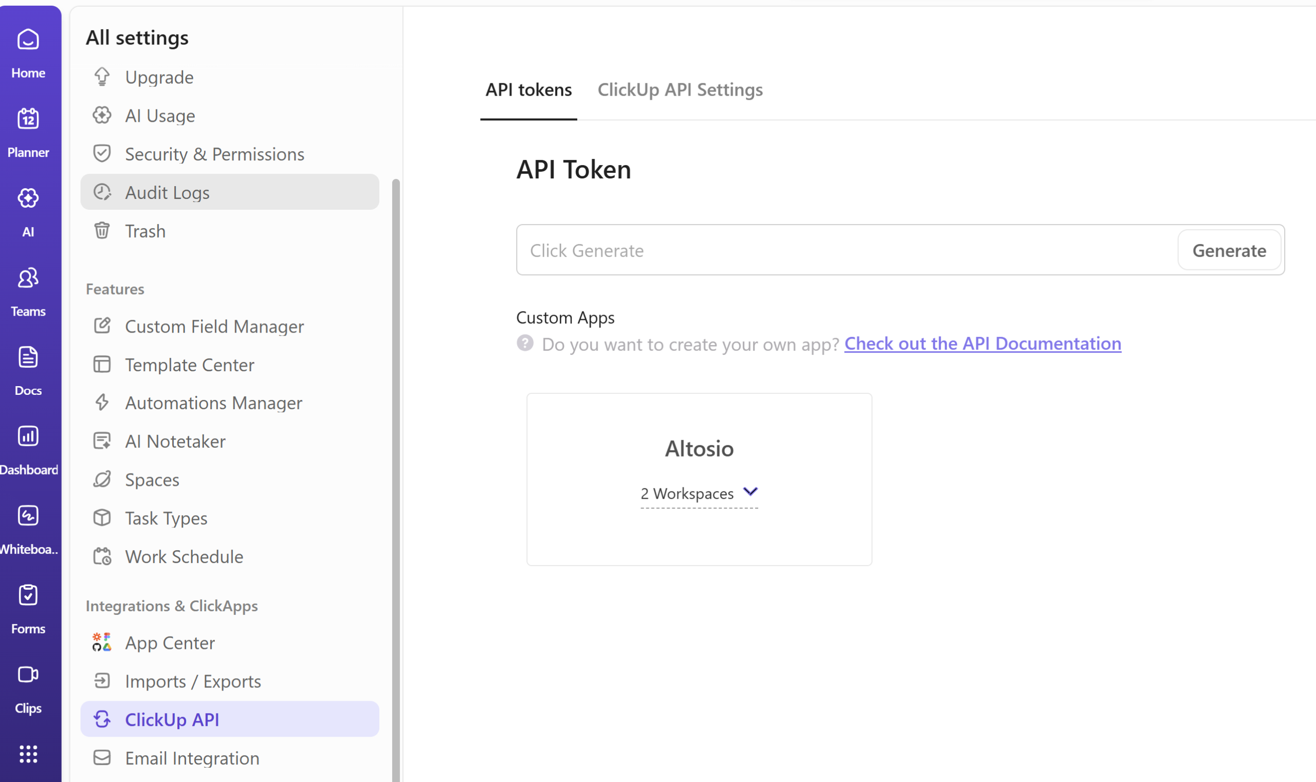 - Go to settings then ClickUp API on the left-hand side menu, as shown in the screenshot below.