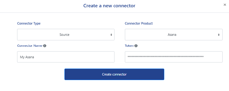 - Click New connector, choose Source, then Asana. Give your connector a meaningful name, then generate your Personal Access Token and paste it in the token field. Click on Create connector to finish the creation process.